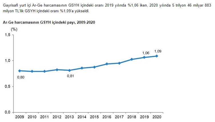 Bir de Ar-Ge harcamalarına bakalım, orada ne durumdayız. TÜİK verilerine göre, devlet Ar-Ge harcamaları için toplam bütçesinin %0,25-0,30 bandında bir ödenek ayırmış durumda. Özel sektör ile birlikte bakıldığında ise, toplam GYSH içinde Ar-Ge için ayırdığımız bütçe %1’in biraz üzerinde ve pozitif yönde bir eğilim var. Özel sektör Ar-Ge için her yıl düzenli bir ödenek artışı yaparken, devlet kendi bütçesinde ise bunu son dönemde azaltmaya başlamış.