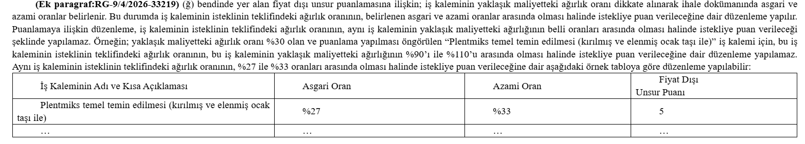 9 Nisan 2026 da Resmi Gazete’de yayınlanan değişiklik ile, artık (ğ) maddesindeki tekliflerin yaklaşık maliyete uyumu konusunda, isteklinin birim fiyatın toplam teklifine oranının hangi aralıkta olması gerektiği net olarak ifade edilmek zorunda olacak. Böylece istekli birim fiyatını yazarken, puan alıp alamayacağını baştan bilebilecek. Sadece idarenin bilebileceği yaklaşık maliyeti ve birim fiyat dağılımını esas tutmak kabul edilmeyecek. Madde bu şekilde asıl amacına ulaşacak.